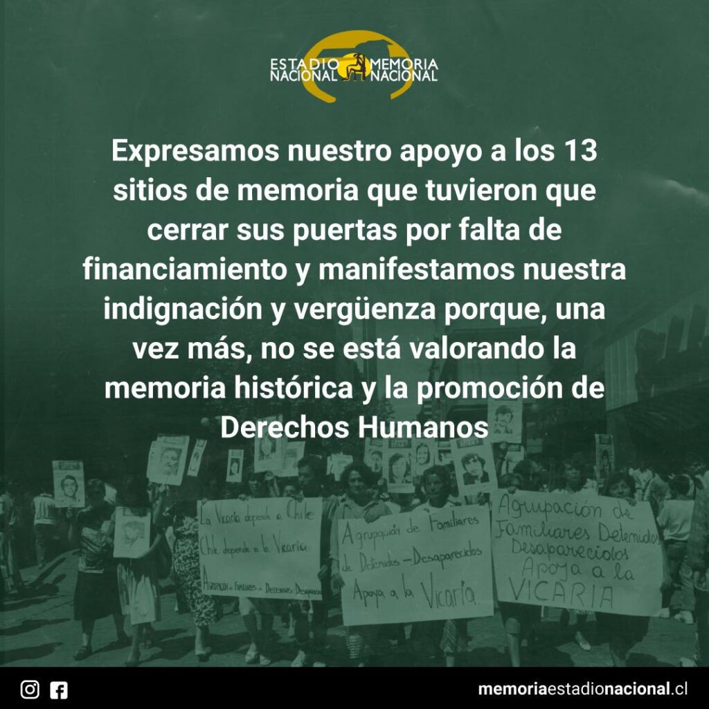 Coordinadora por Palestina, Corporación Estadio Nacional Memoria Nacional, Colectivo Ñuñoa por Palestina Libre, Movimiento BDS Chile, Coordinadora Feminista 8M, Amnistía Internacional Chile, Colectivo La Mesa Palestina, Médicos por Palestina, Coordinadora de Derechos Humanos y Organizaciones Sociales, Mesa de DD.HH. por una Vida Digna, Agrupación de Familiares de Ejecutadas y Ejecutados Políticos, Coordinadora Nacional de Sitios de Memoria, Judíxs Antisionistas contra la Ocupación y el Apartheid, Agrupación Pan y Rosas, Colegio de Psicólogos y Psicólogas de Chile, Movimiento por el Agua y los Territorios MAT, y Movimiento Solidaridad.