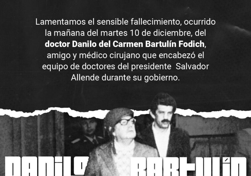 Lamentamos el sensible fallecimiento, ocurrido la mañana del martes 10 de diciembre, del doctor Danilo del Carmen Bartulín Fodich, amigo y médico cirujano que encabezó el equipo de doctores del presidente Salvador Allende durante su gobierno. El doctor Danilo Bartulín fue detenido inmediatamente después del Golpe de Estado y llevado al Estadio Nacional donde fue… -